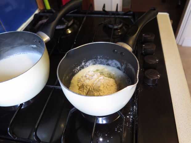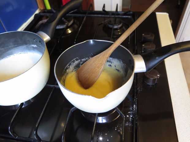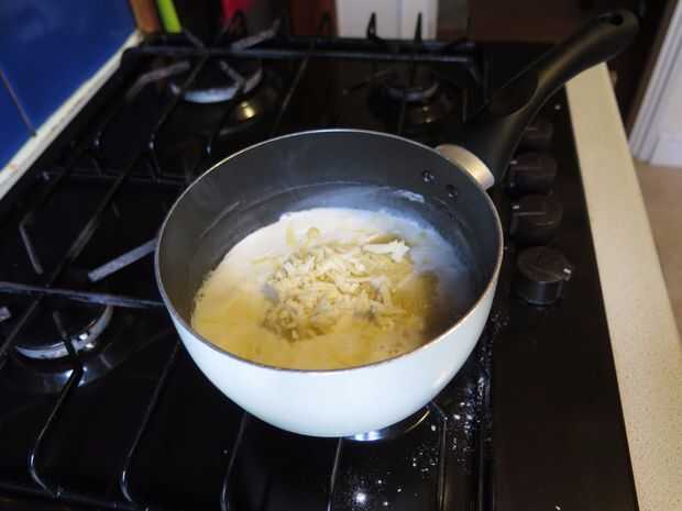 Cuadro 6. mezclar el roux y el cheddar rallado en la leche caliente.