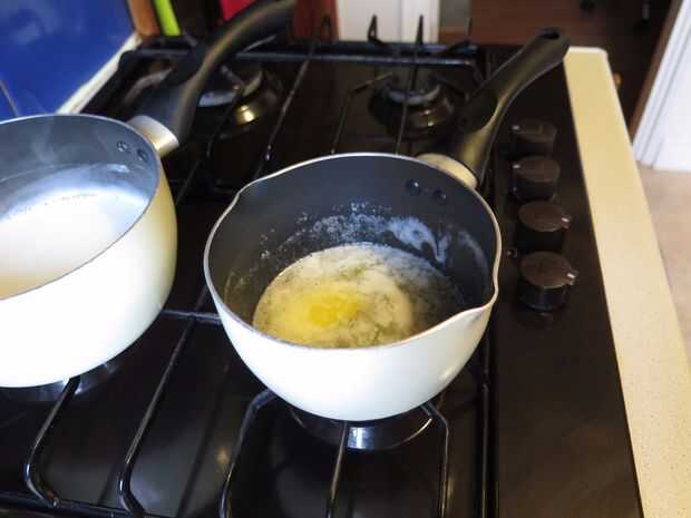 Cuadro 5. con una cuchara de madera mezclar la mantequilla y harina a para el roux y déjelo cocinar demasiado por unos minutos en la sartén.
