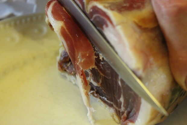 Todos los ingredientes que utilizo son orgánicos pero se adquieren de una manera muy barata. El jamón que estoy usando es de gama alta Parma (jamón crudo). Compro la pieza final o corvejón. Este es un jamón muy caro que se come crudo aquí en Francia como un arrancador y esperan obtener una rebanada fina entera cada uno, así que cuando llega al corvejón, nadie sabe realmente qué hacer con él. Lo consigo de mi carnicero por 5 Euros, que es aproximadamente un décimo del precio habitual. Usando un buen cuchillo que todavía puedo mano corta rodajas finas para el uso en una amplia gama de platos.
