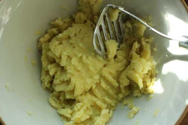 Para hacer la base de este plato es necesario un tipo específico de la papa, que se triture. Estoy usando Ditta y Agria, (foto arriba), lo que en francés se llaman patatas 'firmes' y 'tiernas' y son cultivados localmente. Agria se conoce en inglés como de propósito general y Ditta como ceroso. Por lo que cualquier variedades de papas se cultivan en su país, sólo tiene que buscar estas dos descripciones. Esa manera usted conseguirá algo llevará a cabo su forma.