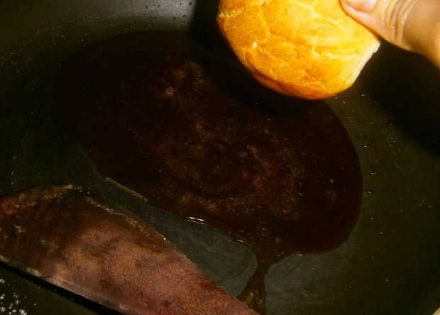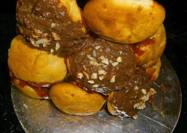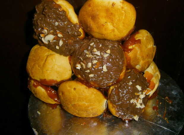 Sumergir la parte inferior de cada bocanada de pastelería en el caramelo y colocar puffs en forma de pirámide.