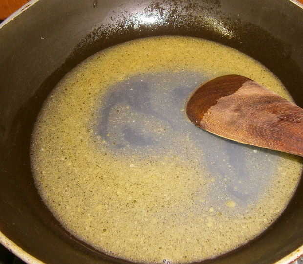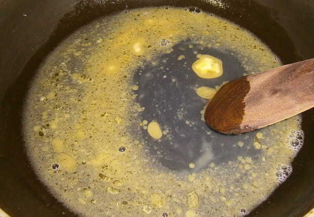 En una cacerola mediana, derrita mantequilla, agua con azúcar. Cuidar que la mantequilla se derrite antes de que hierva el agua.