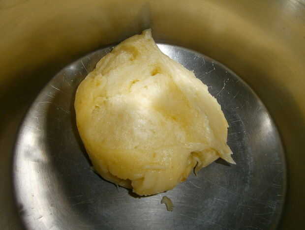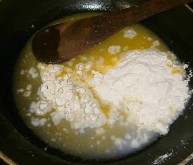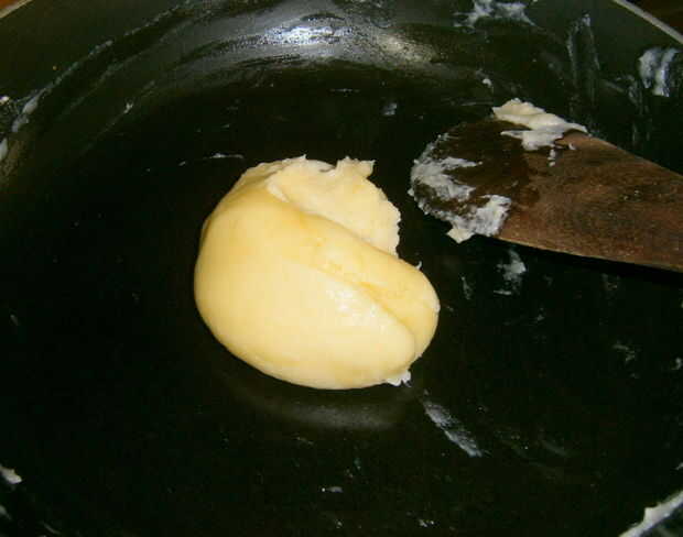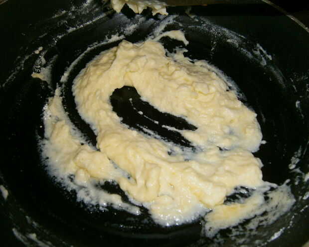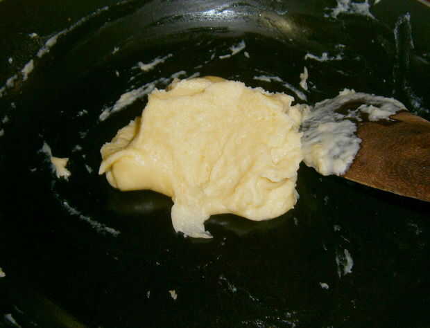 Regresa pan a calor y, usando una cuchara de madera, batir vigorosamente durante 2 a 3 minutos. (Una película delgada debe formar en el fondo de la cacerola).