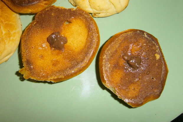 Ahora llene los soplos de la base con salsa de crema de chocolate preparada con la ayuda de una manga pastelera.