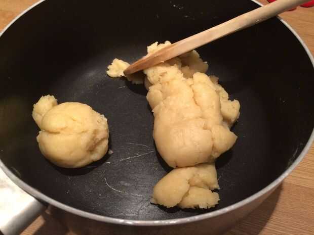 Volver a fuego lento y remover la masa durante 1 minuto, luego retire del fuego. Dejar enfriar 3 minutos.
