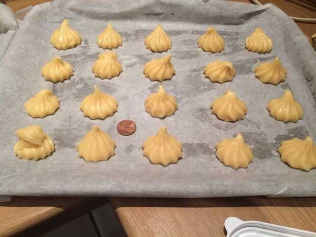 Poco a poco añadir el huevo batido a la masa, batiendo bien entre cada adición, hasta que la masa esté lisa y brillante. Línea de una gran plana para hornear con papel parafinado. Con el mayor de sus dos boquillas de tubería, tubo de alrededor de 30 bolitas de masa sobre la bandeja para hornear, dejando espacio entre cada uno para elevar. Ver penny para la escala en mi foto.