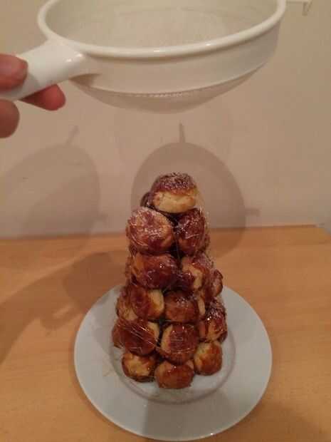 A continuación tienes la opción de desempolvar su croquembouche con azúcar glas. Esto hace que se vea bastante festivo y saca los hilos de azúcar muy bien.