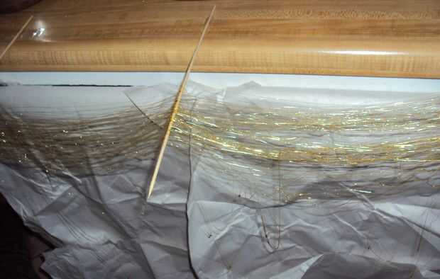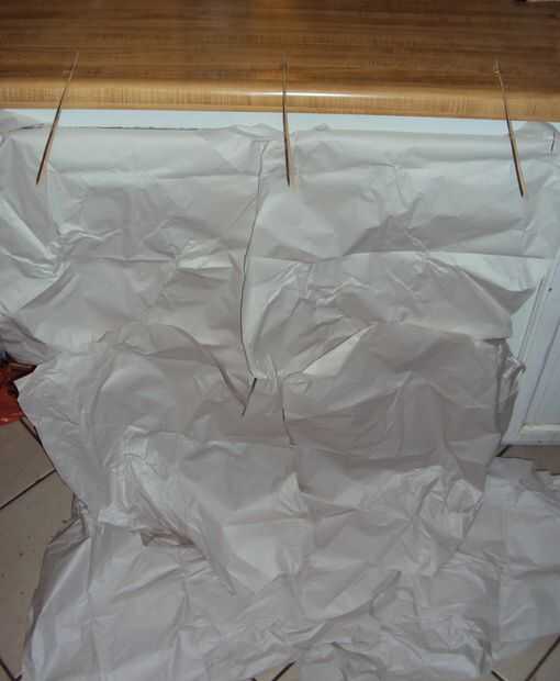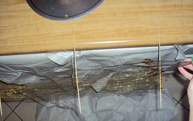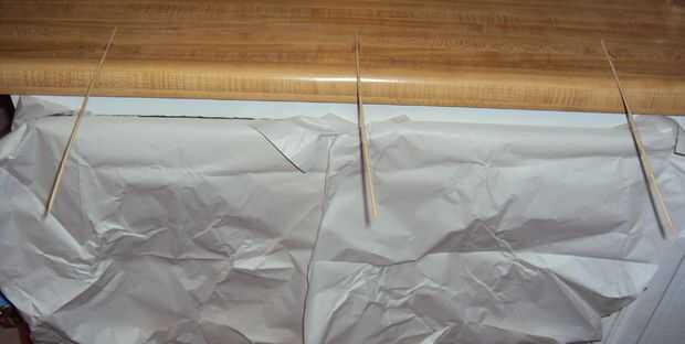 Para mi hilo de azúcar establecido, había grabado 3 pinchos de madera finas para el contador y había protegido de los gabinetes y el piso por debajo con papel de carnicería.