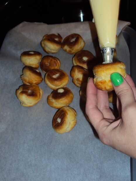 Llene cada bocanada con crema pastelera, cuidado de no sobrellenarlo.