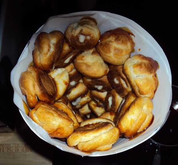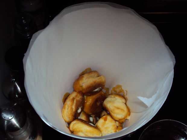 Escoger un bonito hojaldre y sumergir en la salsa de caramelo. ¡Ten cuidado! El caramelo es muy caliente y super pegajosa. Colocar el hojaldre bastante en la punta del cono (debe meter por el agujero un poco, pero no el fin del mundo si no es así)