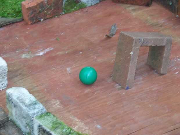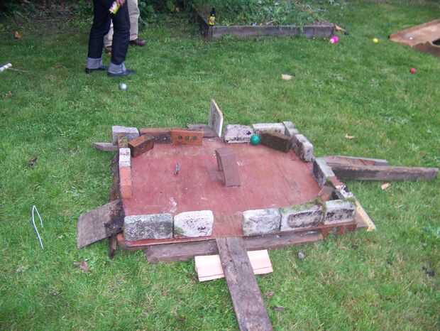 Esto es un obstáculo muy básico, simplemente una hoja de 1/4" madera contrachapada sobre algunos ladrillos, con rampas que conducían a él de cada lado. También hay un bloque roto en el medio que utilizamos como un wicket adicional. Terminamos haciendo una pared alrededor de él con más ladrillos, ya que la madera estaba alterada y la yarda era desigual y mantienen caída de las bolas. Este obstáculo fue el primero de la puerta y por lo tanto también el último. Es mucho más fácil ir por primera vez.