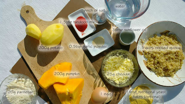 8. cuchara de la mezcla en la mano (no se preocupe, usted les puede lamer limpio más tarde, me refiero a lavar limpio... sí, lavar. Que es lo que me refería), forman un bloque pequeño (como una baraja de cartas) y luego cubrirla con la quinua cocida. Puede simplemente presionar la quinoa en el puré, dan la vuelta y cubrir el otro lado. Puede forma la croqueta al mismo tiempo, luego coloque sobre un plato y lo mismo con el resto del puré. Me las arreglé para hacer 5 croquetas enormes, no dude en hacer los más pequeños - pero si lo haces te te necesita más quinua como la superficie de las croquetas se incrementará. Serán más fáciles de cocinar, si son más pequeños. Una vez has utilizado todo su puré, poner sus croquetas en la nevera durante unos 20 minutos para relajarse.