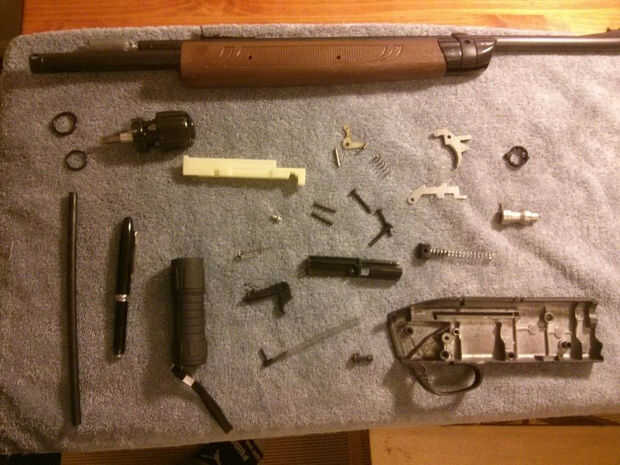 Luego sacar (el orden es aproximado): el dispositivo de seguridad Arandela de bloqueo y bloqueo pin; el retenedor de brazo armado; la perilla del perno y el resorte; el gatillo, gatillo resorte y pasador del gatillo; y la primavera para dorar, dorar pin y para dorar.