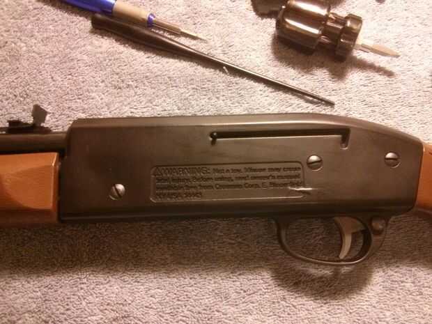 Asegúrese de que el arma esté descargado y cualquier alivio de presión de aire. Retire los tres tornillos del receptor y con cuidado apalanque aparte a las dos mitades. Pick de guitarra de un destornillador plano o algo que trata de otra herramienta de curiosos es útil aquí. Si quieres una aventura deje el perno palanca lateral hacia abajo y rápidamente separar las dos mitades. Usted será recompensado por resortes y otras piezas volando en todas direcciones. Aquellos que son menos aventureros quieran voltear la pistola y coloque el lado plano del receptor hacia abajo. Abrir las dos mitades de un 1/8 de pulgada y con cuidado retire el perno retén abierto y primavera. Si tiene cuidado de que todo lo demás debe permanecer en el lugar.