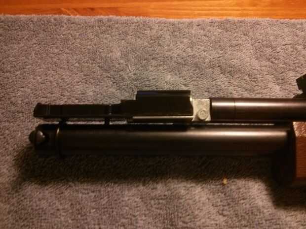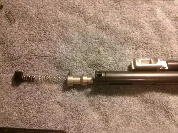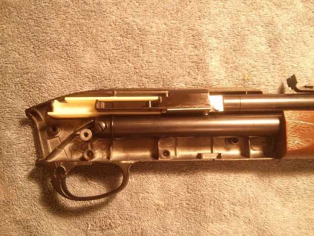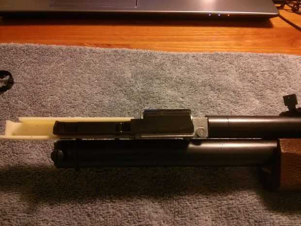 Ahora la diversión parte. Con el mango de empuje de BB hacia arriba, baje el receptor con la ranura para el empujador de BB en el montaje. Es necesario deslizar el receptor sobre el empujador de BB sin golpear sobre. Con la práctica esto es bastante fácil. La primera vez es bastante difícil.