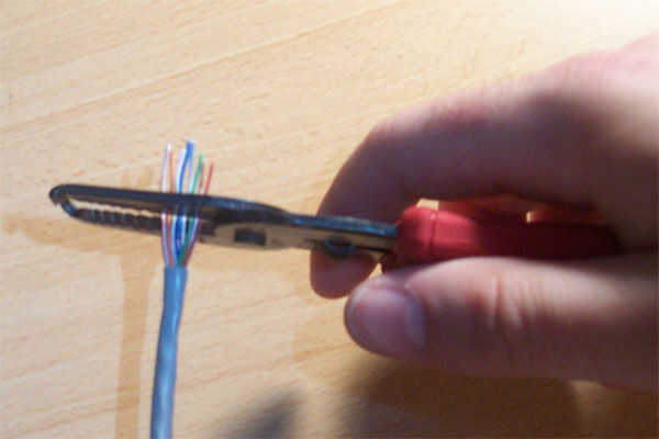 Nuevo recorte el cable sobrante, dar su auto sobre. 5" a. 75" para insertar en la Cat-5 del enchufe.