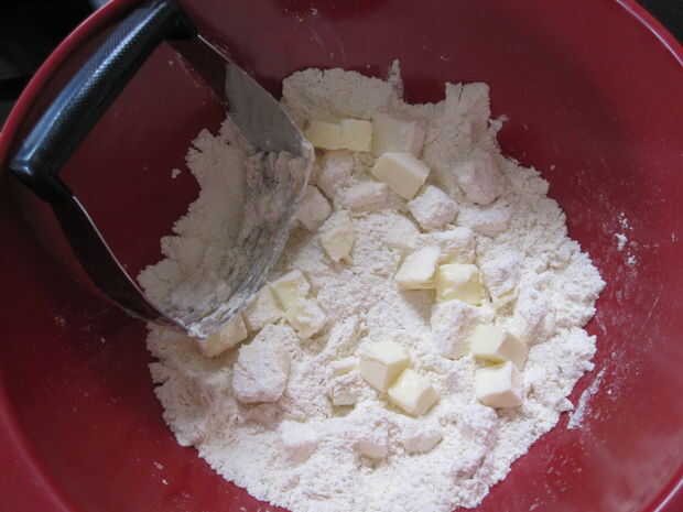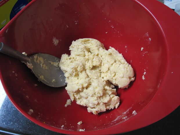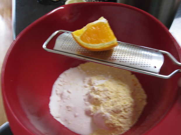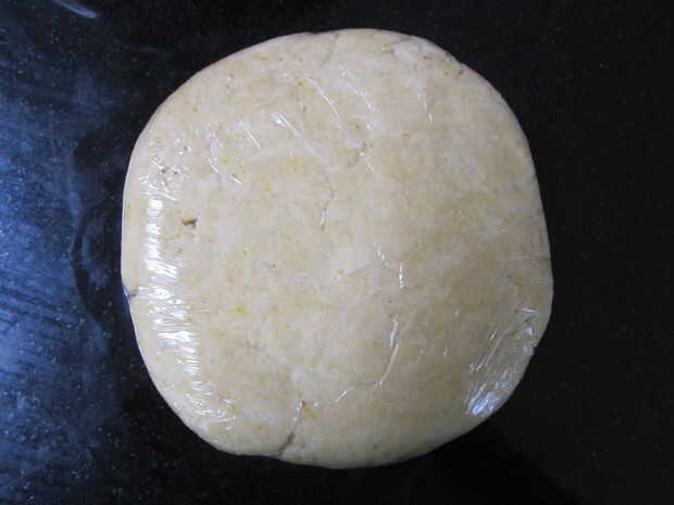 Mezclar la harina, harina de maíz, azúcar, ralladura de naranja y sal en un tazón grande. Si está utilizando un procesador de alimentos, mezclar los ingredientes. Cortar la mantequilla en cubos de 1/2 pulgada y añadir a la mezcla. Cortar la mantequilla en los ingredientes secos o la mezcla hasta que se reduzca la mantequilla a trozos del tamaño de guisante. Añadir 1/3 taza agua con hielo y use una cuchara grande (yo usé una paleta de helado) para mezclar la masa hasta que aglutina en una masa. También puede continuar mezclar en el procesador de alimentos hasta que produce. Si no es agrupar la masa, agregar un adicional 1 cucharadita de agua helada. Recoger la masa en una bola y luego aplanarlo en un disco. Envuelva la masa y enfriar durante al menos una hora antes de hornear. La masa puede guardarse en la nevera por hasta un día antes de hornear.
