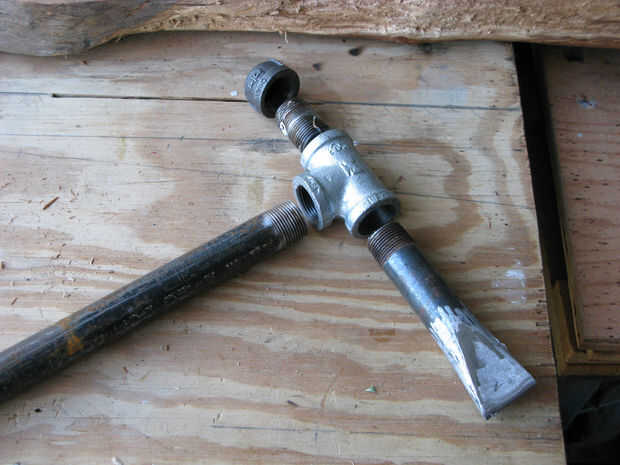 El extremo del mango tiene un 3/4""T", sección de rosca de 1", 3/4" tapa para actuar como un martillo/smasher y 4" 3/4" tubo aplanada y afilada en un extremo para actuar como una barra de palanca/cuervo.