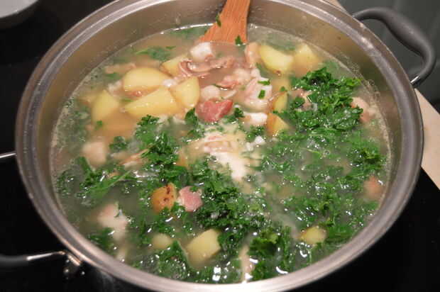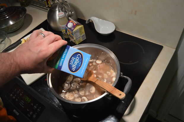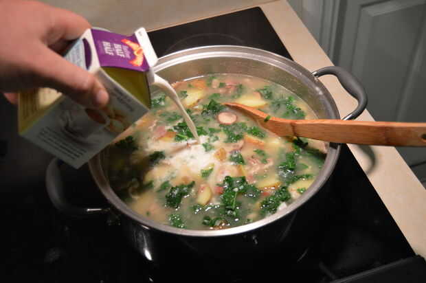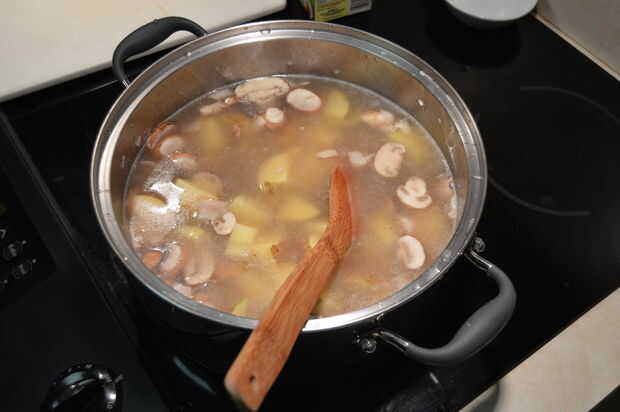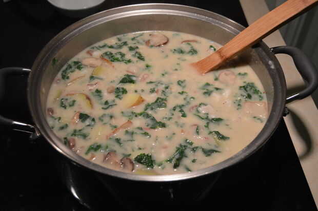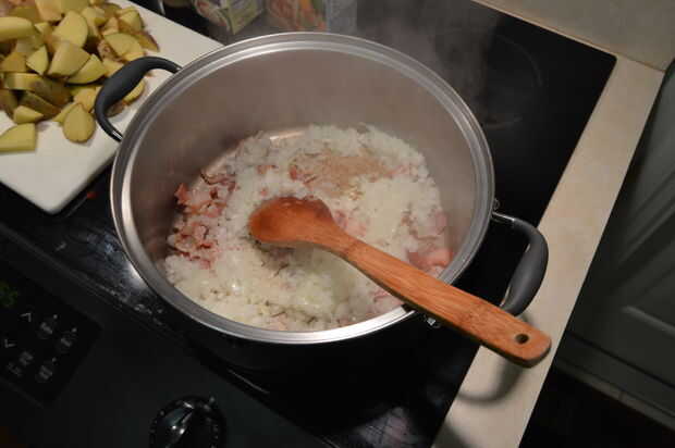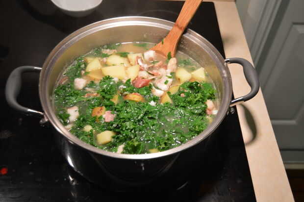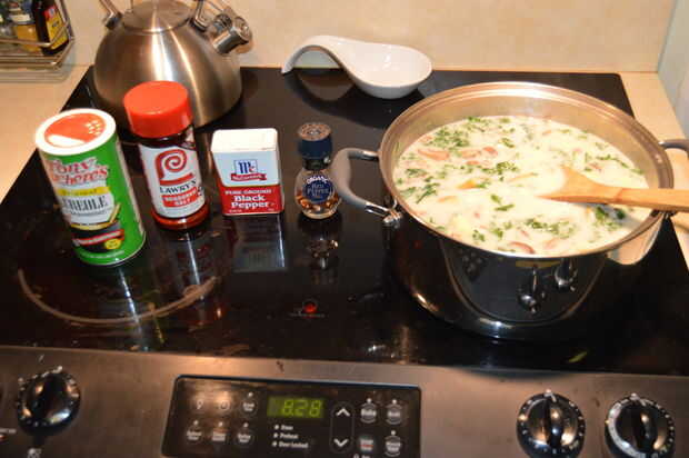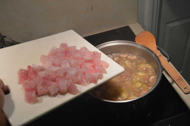 En un olla grande el cocinero hasta el tocino cortado hasta la mayoría de la grasa ha cocinado la carne. A continuación añadir la cebolla picada y los champiñones en rodajas, rehogar con el bacon hasta que las setas estén blandas (unos 3-5 minutos). A continuación añadir el caldo seguido por el corte encima de patatas. Llevar a ebullición y continuar la cocción hasta que las papas estén suaves (prueba por aplastamiento contra el lado de la olla). Una vez que el inicio de papas para suavizar agregar en el pescado en cubitos a la mezcla hirvienda, cocinar en un hervor durante unos minutos más hasta que el pescado esté cocido completamente (se vuelven de un color blanco y escama fácilmente cuando totalmente cocido). Ahora añadir la col rizada como apaga el fuego, añadir la col rizada completamente. Ahora añadir la mezcla de harina y jugo de almeja junto con la taza de crema. Mezclar hasta consistencia uniforme. Por último añadir tus especias al gusto. Un enfoque clásico sería añadir condimento Bahía antigua, pero armé mi propio brebaje de Tony, sazonada de sal, pimienta negra y pimienta roja machacada.