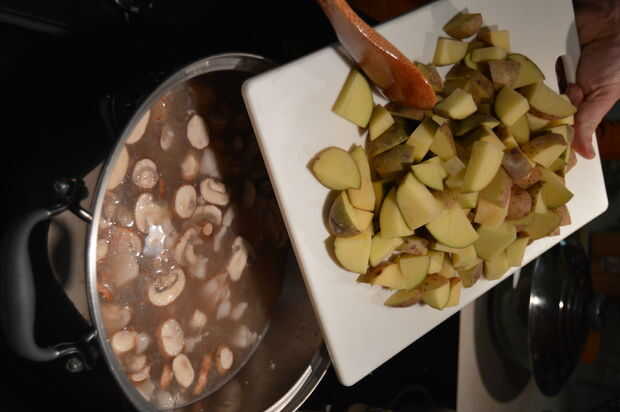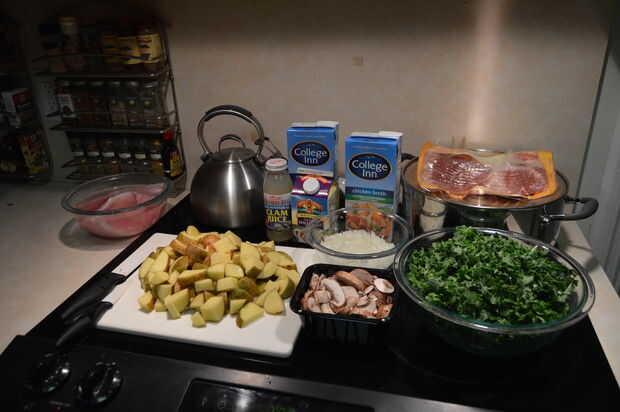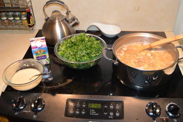 Cortar las cebollas en cuadritos, lavado elegir la col rizada, lavar champiñones, lavar y cortar las patatas en cubos, cortar el tocino y mezclar el vaso de jugo de almejas con las cucharas de tres mesa de harina. Sistema cada uno a un lado para ser utilizados durante el proceso de cocción.