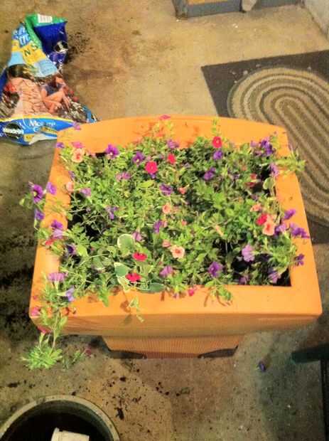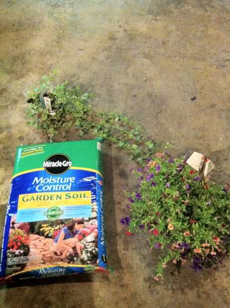Ahora estamos listos para llenar con tierra! Usé "Milagro crecen: Control de humedad" que también recibí de Home Depot. Me decidí a planta un bonito colorido al aire libre por lo que será capaz de obtener un montón de sol. Las plantas de vid pequeña son agradables toques a hundirse en los bordes del monitor.