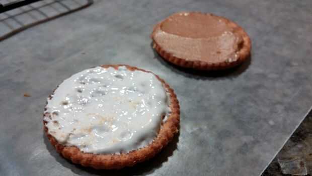 a continuación, extender crema de malvavisco en un lado de la otra galleta. Las mismas salvedades se aplican a la crema de malvavisco. Encima no se porque el exceso solo haz exprimido hacia fuera durante el montaje o inmersión. Crema de malvavisco puede ser un poco pegajoso así que deberás tener cuidado al extenderla para evitar romper la galleta.