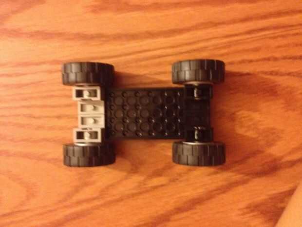 Consigue un trozo de base de lego de 4 por 10 e Instale las ruedas como en la foto. Recuerde dejar una tira de 1 por 4 en el final como yo no en la foto.