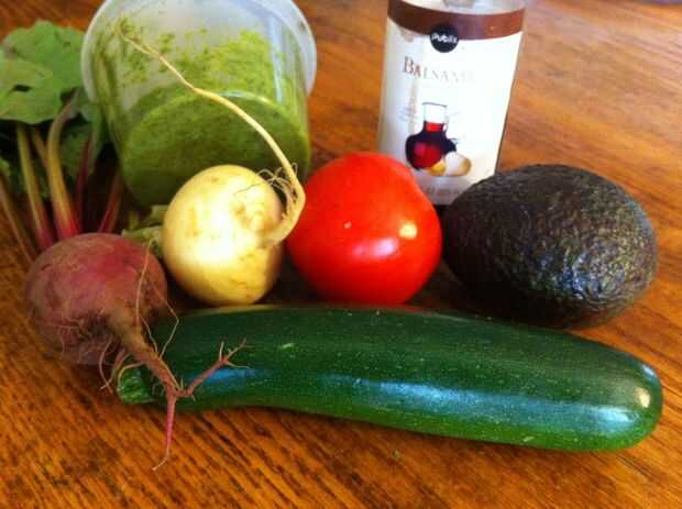 me encanta esta receta porque su sencilla, rápida, deliciosa y saludable se necesita: tomate de 1small 1 calabacín medio un aguacate algunos cebolla si quieres pesto de albahaca casero (voy a publicar una receta para esto también) vinagre balsámico opcional raíz vegetal para rallar por encima (yo usé un nabo y una remolacha)