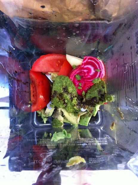 Picar el aguacate, el tomate y la cebolla. Lanzarlas con 1-2 cucharadas de pesto de albahaca y un chorrito de vinagre balsámico. Luego rallar de la remolacha en la parte superior. O si tienes un procesador de alimentos puede mezclarlos juntos en una salsa. ¡ Disfrute!