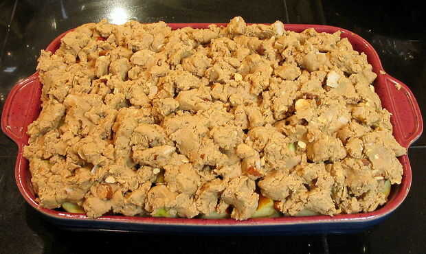 Desmoronarse la capa sobre la fruta, asegurándose de que la entera superficie si razonablemente cubiertos. No embale demasiado grueso - usted quiere aire y líquido a ser capaces de burbuja hacia arriba y escape durante la cocción.