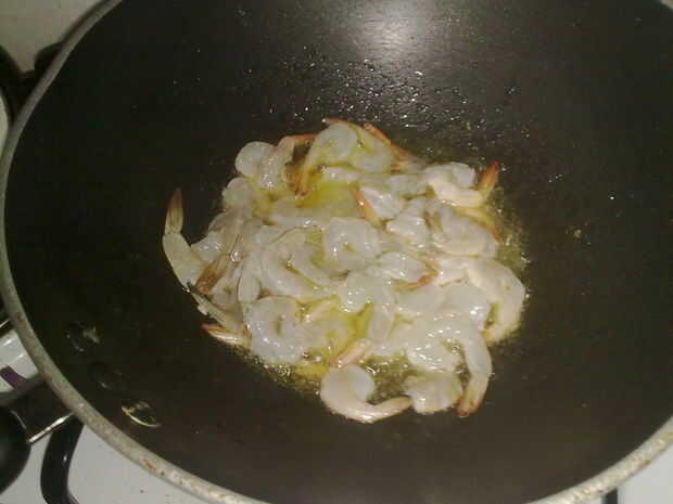 Primero agregue el aceite de sésamo y el aceite vegetal en un wok y calor... luego añadir los camarones y revuelva freír hasta su casi pero no completamente hecho, hacerlo en lotes de 2 porque su mucho más fácil, retire las gambas del aceite, drenar el aceite para que quede una cucharada de aceite de cantidad.