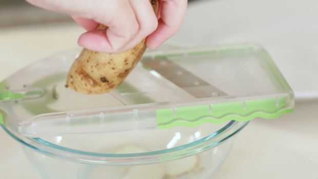 Ahora queremos cortar nuestras patatas muy finas. Un rebanador mandolina funciona muy bien para esto. Puede utilizar un cuchillo, pero lleva mucho más tiempo, y no es tan fácil de conseguir buen rebanadas uniformes.