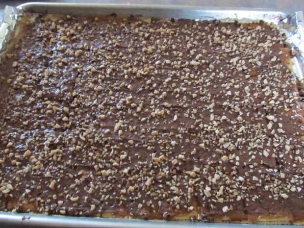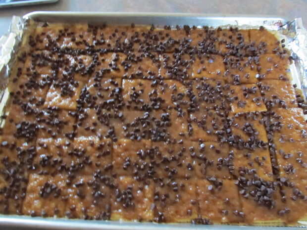 Espolvorear sus trocitos de chocolate encima del caramelo caliente y dejarlos derretir. Entonces separó hacia fuera en la parte superior.