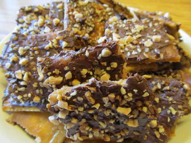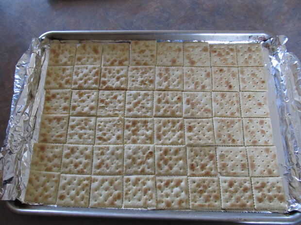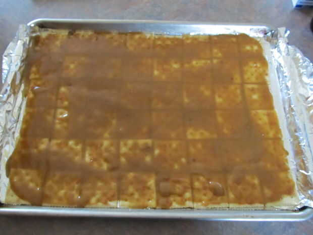 Verter el caramelo sobre las galletas y extendió para cubrir todas las galletas.