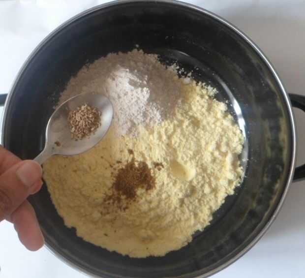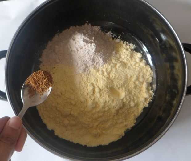 -Tomar un tazón de fuente agregar harina de maíz y harina de trigo o harina de todo uso.