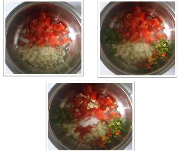 -Tomar un tazón y agregar cebolla, tomate, chiles verdes y rebanadas de pimiento.