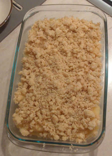 el crumble de manzana pera es una variación de invierno de la clásica tarta de manzana americana.Primero rodajas finas las manzanas y peras son lanzadas en Ron dulce con especias y las pasas de uva, entonces servidas en una tarta con un crumble de es