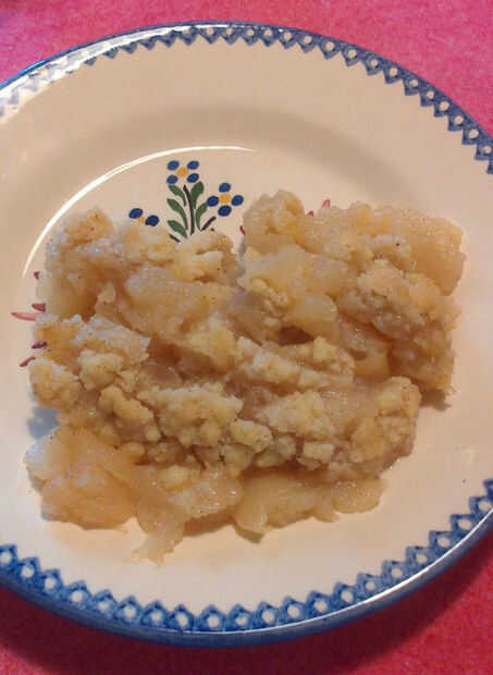 el crumble de manzana pera es una variación de invierno de la clásica tarta de manzana americana.Primero rodajas finas las manzanas y peras son lanzadas en Ron dulce con especias y las pasas de uva, entonces servidas en una tarta con un crumble de es