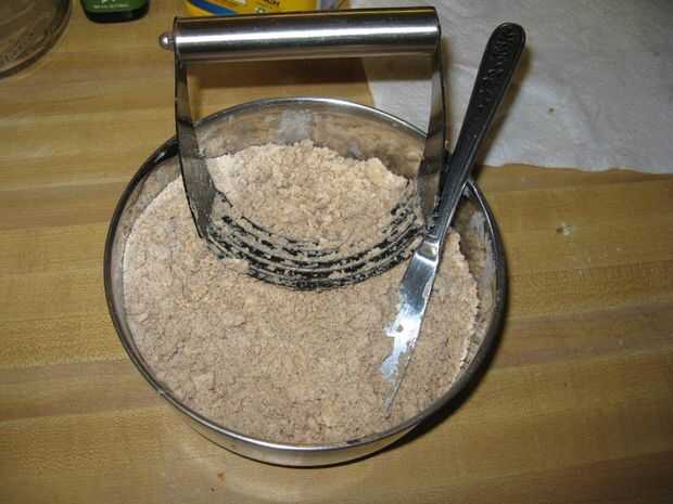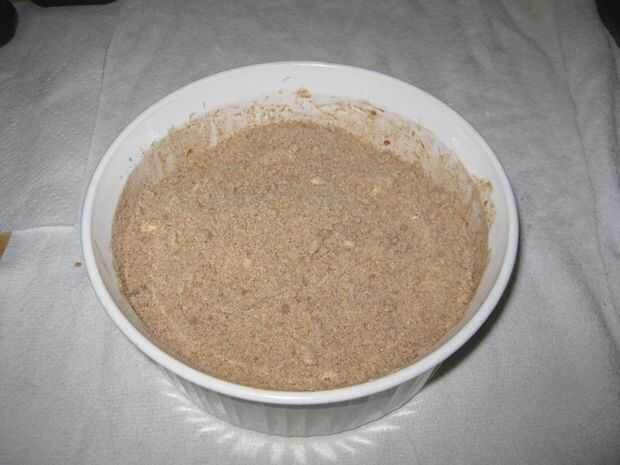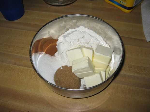 TOPPING - combinar la azúcar blanca, 1/8 taza de azúcar morena, harina y canela en un tazón. Corte la mantequilla fría en la mezcla de canela con un mezclador de repostería o dos cuchillos hasta que la mezcla se asemeja a las migas gruesas.