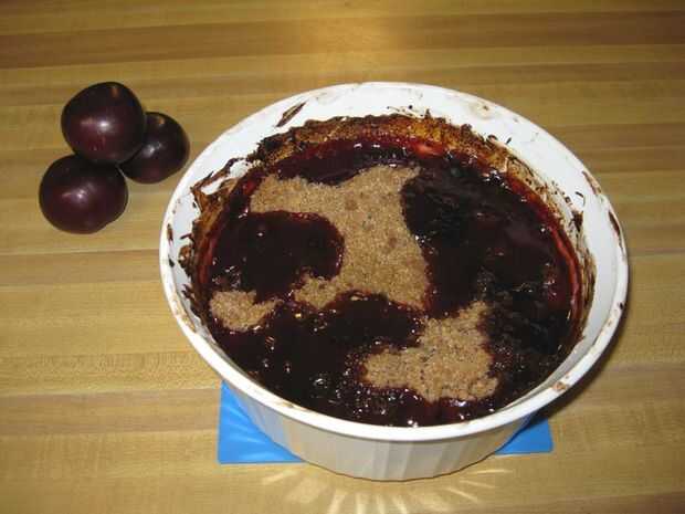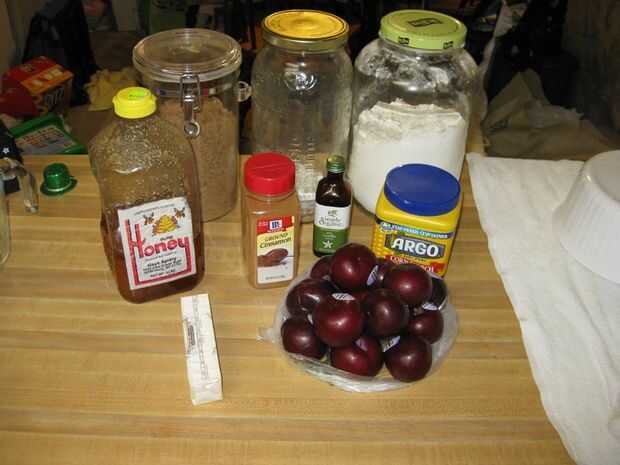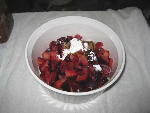 RELLENO - generosamente mantequilla un plato para hornear 1 y 1/2-quart. Colocar las ciruelas en rodajas en el plato y espolvorear con la maicena, 3/4 taza de azúcar morena y canela. Añadir la miel y la vainilla, mezclar el relleno juntas suavemente y extenderlo uniformemente otra vez.