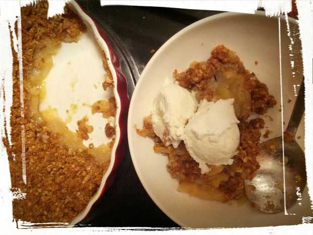 el crumble de manzana pera es una variación de invierno de la clásica tarta de manzana americana.Primero rodajas finas las manzanas y peras son lanzadas en Ron dulce con especias y las pasas de uva, entonces servidas en una tarta con un crumble de es