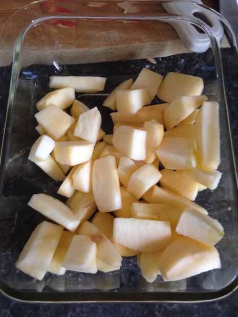 • Cuando haya terminado de cortar encima de la manzana poner todo en el plato de vidrio distribuido uniformemente en la parte inferior, ahora puede espolvorear 2 cucharadas de azúcar tengo la parte superior.
