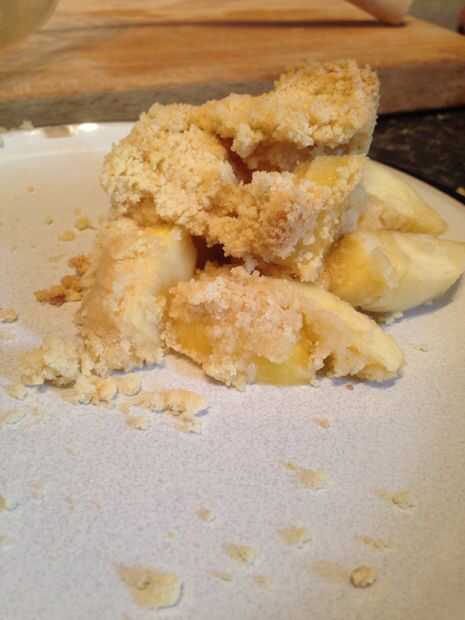 el crumble de manzana pera es una variación de invierno de la clásica tarta de manzana americana.Primero rodajas finas las manzanas y peras son lanzadas en Ron dulce con especias y las pasas de uva, entonces servidas en una tarta con un crumble de es