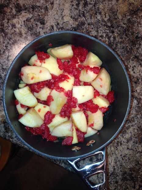 Primero conseguir una olla pequeña, añadir las frambuesas, las manzanas y agua y ponerla en la estufa a fuego lento (que tendrás que revolverlo) hasta que las manzanas estén suaves