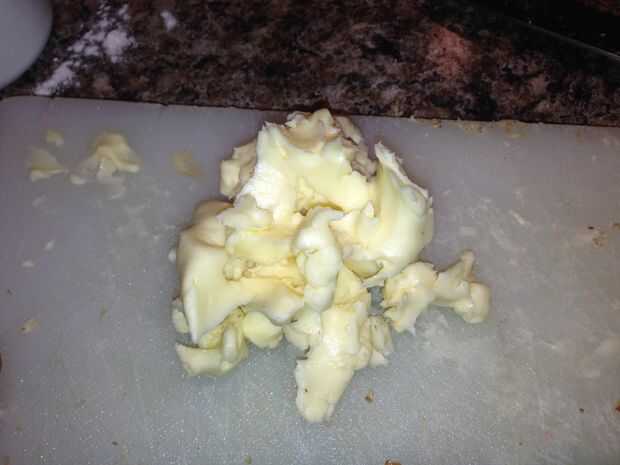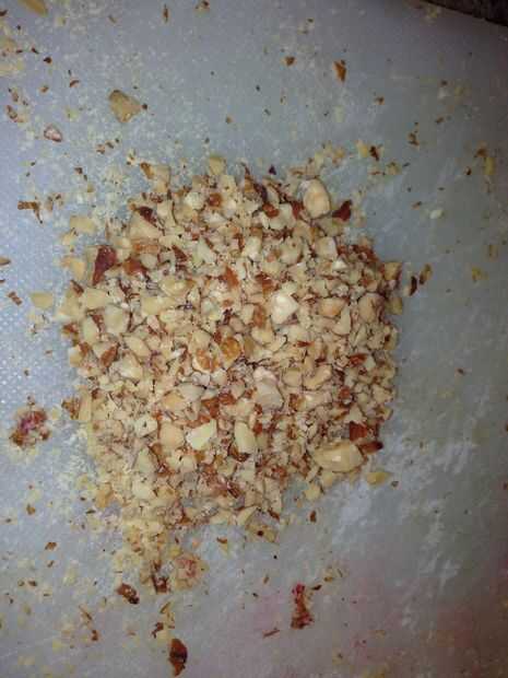 Primero picar las nueces (yo uso las almendras). Luego se mezclan todos los ingredientes secos y las nueces picadas juntas en un bol. Luego se mezclan con la mantequilla y pellizcar con los ingredientes secos hasta que todo en pequeños pedazos y aparece el crumble como.
