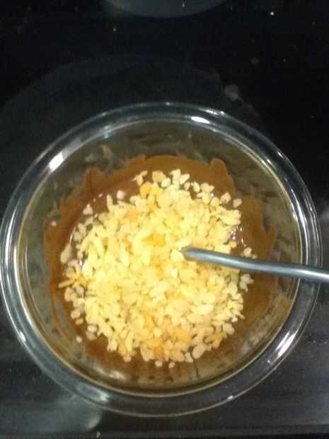 Después de que el chocolate es una consistencia cremosa, agregar la cantidad deseada de arroz Krispies. (Lo bueno de este proyecto es que usted puede hacer que quieras!) entonces les revuelva el chocolate.