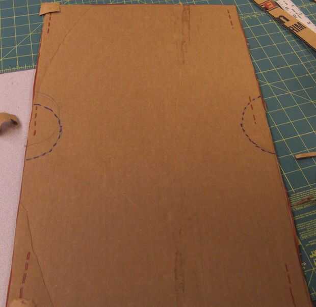 Dimensión y dibujar un rectángulo de 14'' x 21'' con el gobernante (T3) y lápiz (T4) en la hoja de cartón (S1). Mida y marque las ranuras a los lados del rectángulo con la regla (T3) y lápiz (T4). Coloque la almohadilla de corte (T1) abajo y corte a lo largo del contorno dibujado con el cuchillo (T2). En la almohadilla de corte (T1) cortar las ranuras con el cuchillo (T2).
