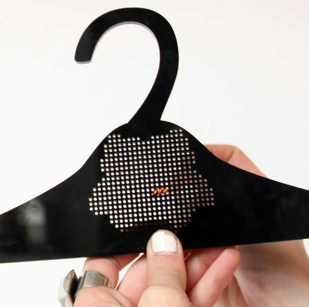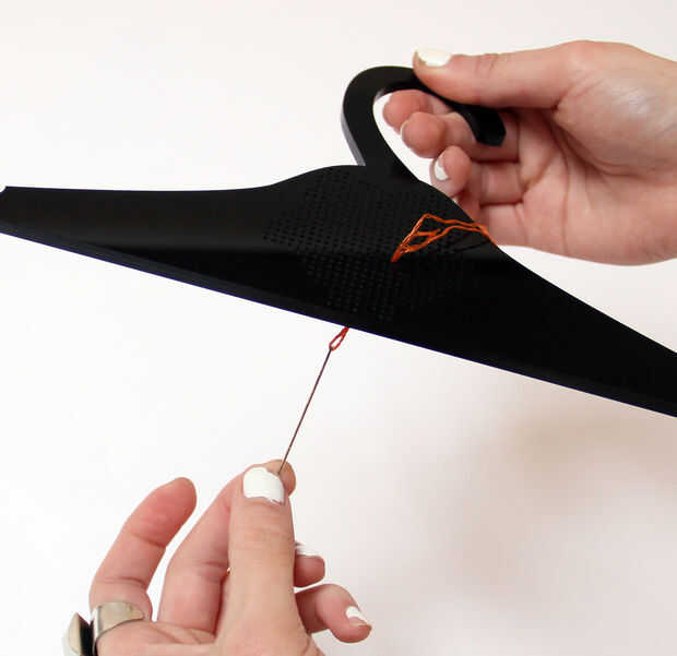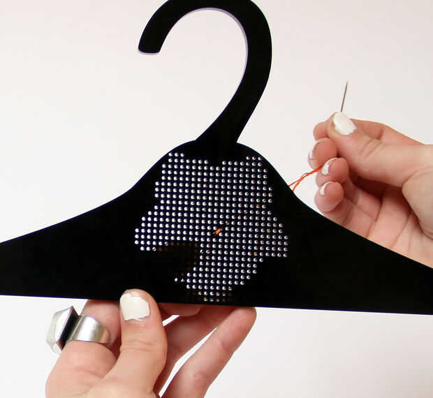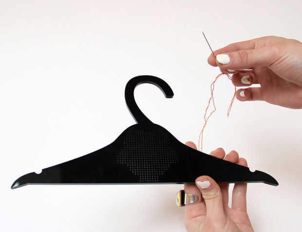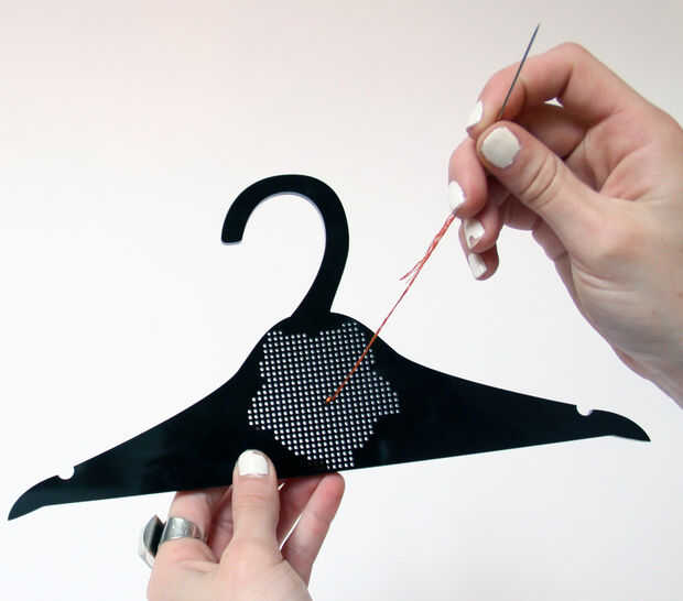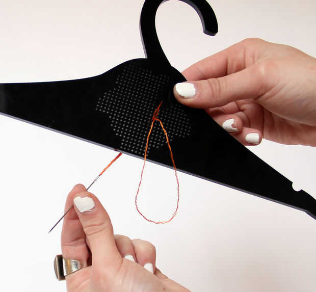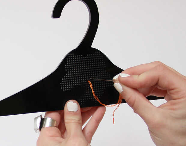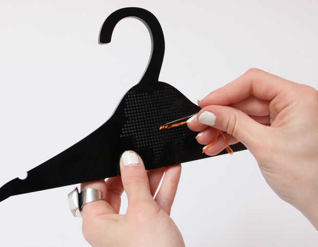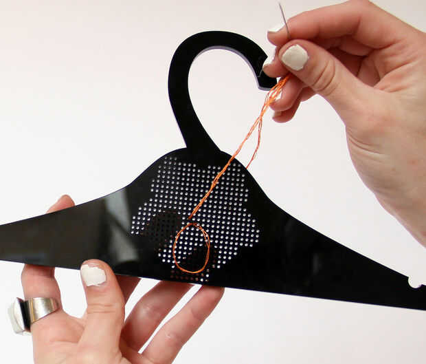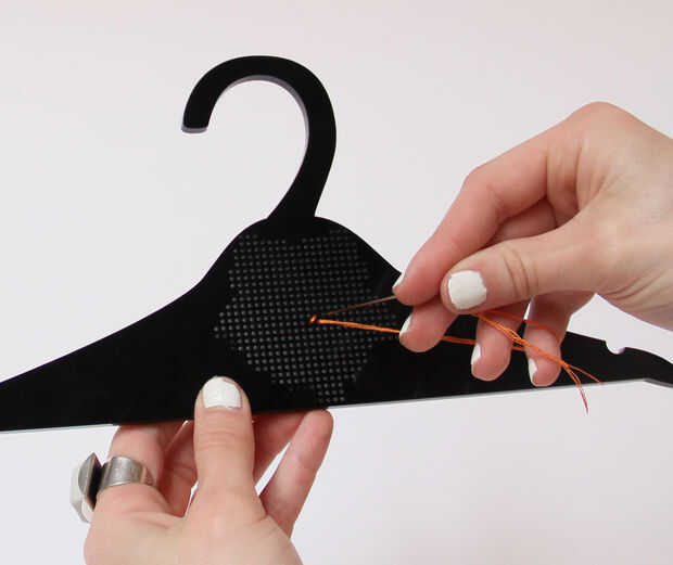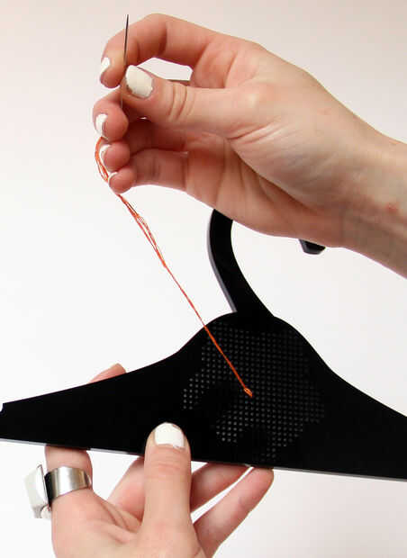 - Desde el comienzo de su patrón, tire de la aguja a través de la parte posterior de la suspensión.