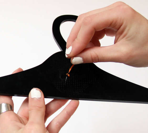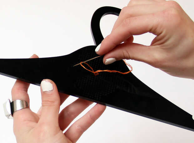 - En la parte delantera, introduzca la aguja a través de un orificio diagonal a la izquierda del agujero que solo jale el hilo a través de.
