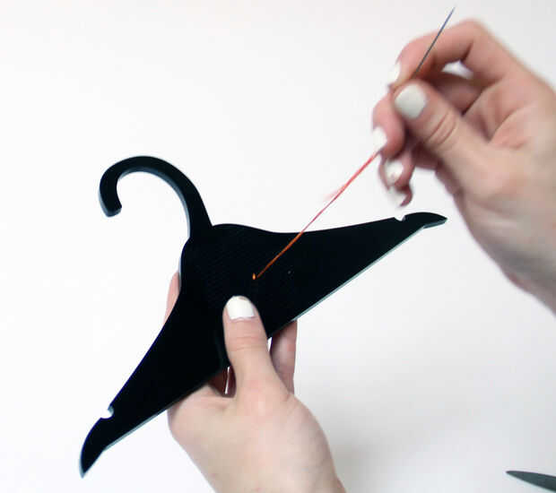 - En la parte trasera, tire de la aguja por el bucle de hilo que dejaste. Esto asegura el hilo de la suspensión sin nudos cualquier feo.
